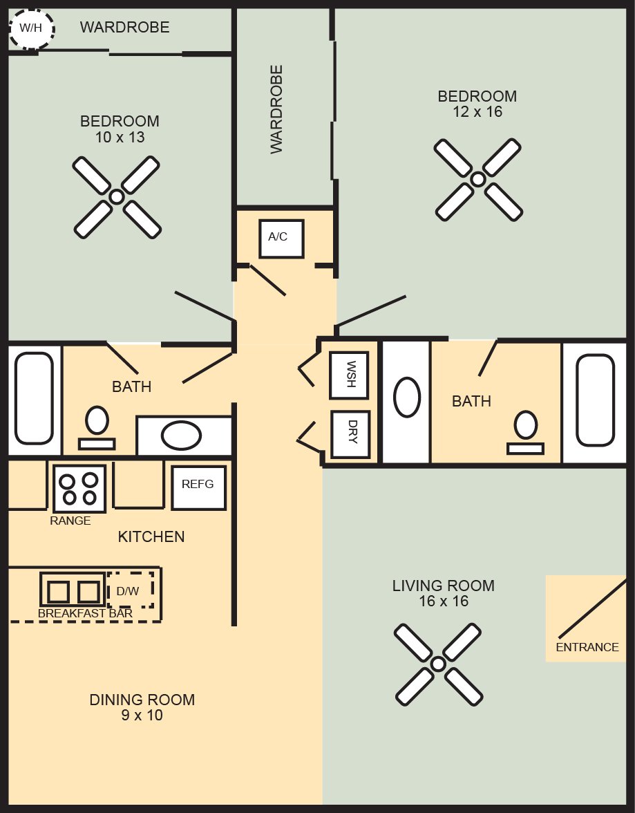 Oak Terrace amenities include a par-3, 3 hole golf course, three tennis courts, two swimming pools with BBQ areas, a lighted jogging trail, playground, basketball court, laundry facility and limited access gate.All apartments are equipped with a selfcleaning oven, frostfree refrigerator, garbage disposal and a dishwasher; some apartments have washers and dryers or connections. Apartments have tile and carpet, walk-in closets, mini-blinds and ceiling fans in the bedrooms and living room.